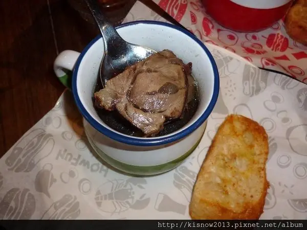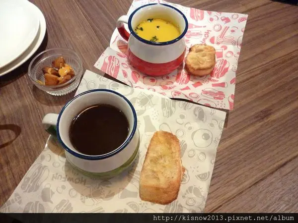 湯類部份是南瓜濃湯和洋葱清湯,兩碗湯都用迷你小盅盛裝,看起來很有精緻感,搭配薄薄一小片的麵包.麵包吃起來的口感較為酥硬,最好搭配湯汁軟化,比較好入口.