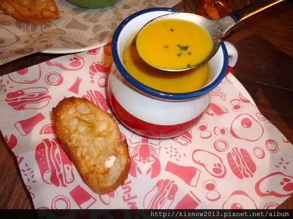 南瓜濃湯呈現金黃色,喝起來的口感清淡,南瓜滋味不太明顯.