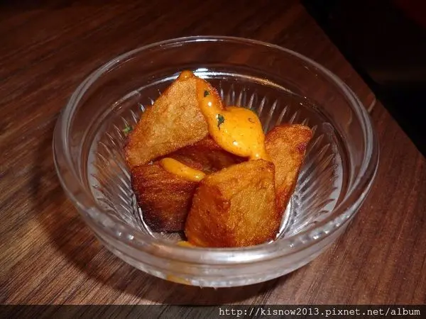 店家還招待一份馬鈴薯小點心,馬鈴薯經過油炸,沒有裹上多餘的炸粉,淋上一點黃色醬汁,吃起來的口感新鮮鬆軟,尤其加入黃色特製醬汁,再配合熱度,口感更是美味可口,這道小點心讓我相當喜歡.