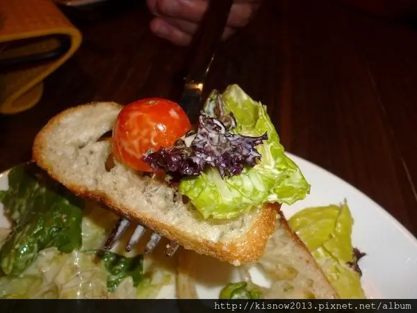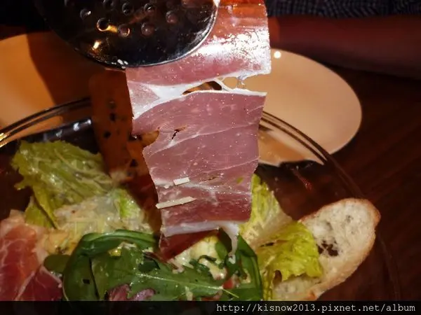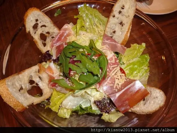 沙拉部份有三種選擇,我是選擇經典凱薩沙拉,它是由蘿蔓生菜,小蕃茄,生火腿片和麵包片所構成,再加入特製醬汁和乳酪絲,吃之前先攪拌一下,生火腿最特別,它呈現紅色,油脂稀少,質感薄如蟬翼,吃起來的口感偏鹹,如同醃肉片,它在生菜沙拉中,只是提味的角色,增加生菜沙拉的風味和鹹度,蘿蔓生菜因為沾上特製醬汁和乳酪絲,口感除了鮮脆,還帶著濃郁.麵包片適合和生菜一起搭配,增加薄脆的口感.