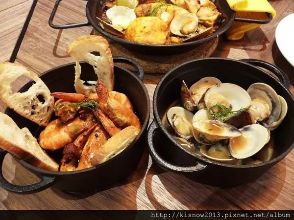 這家店的西班牙小點種類蠻多,西班牙小點如同我們常說的小菜,通常在酒館是作下酒菜之用,所以口感上比較偏重一點,這次的西班牙小點,我是選擇大蒜蝦和蒜香白酒蛤蜊.都是用小黑鍋盛裝.