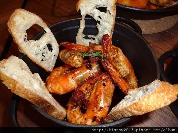 大蒜蝦搭配麵包片,蝦子外表看起來油亮動人,所採用都是橄欖油,蝦子外殼和長鬚部份都剔除乾淨,看得到店家的用心,所以吃起來不容易被刮傷,也不會太費力,吃起來的口感,蝦子肉質紮實鮮甜,經過欖橄油的加持,增加蝦子的油香滋味,麵包質感香脆,沾上油香微辣的橄欖油,如同蝦片一般的美味.