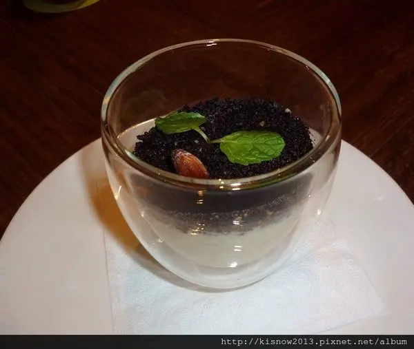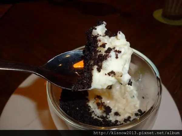 雖然之前在冷凍櫃看到各式蛋糕,但甜點部份卻選擇米布丁,因為米布丁至今尚未嚐試過.白色的米布丁灑上黑色餅乾碎屑,製造出黑白分明的感覺,米布丁配合餅乾屑吃進口裡,米布丁濃郁香甜,米粒吸收濃郁奶香,吃起來是飽滿綿密,口感類似香甜的燉飯,餅乾屑增加香脆的口感,使得米布丁整体口感具有兩種不同的層次.