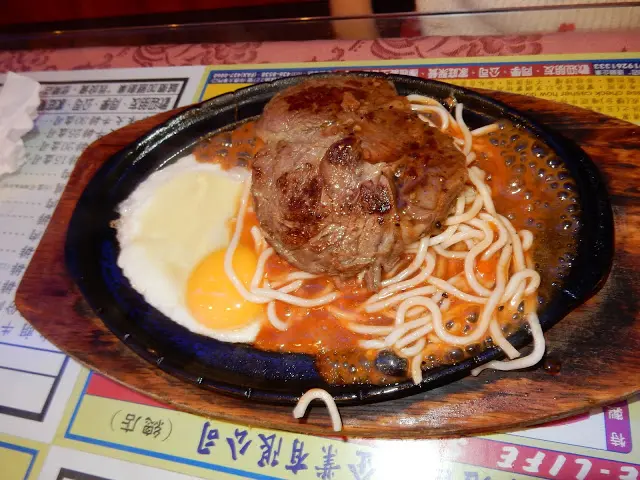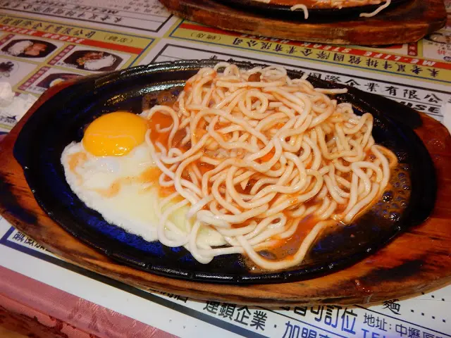 份熟度不足。鐵板麵為細麵條,附了半熟蛋,請記得自行翻面。