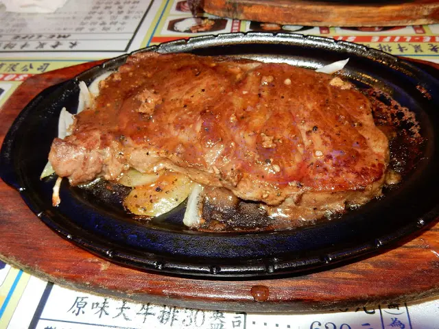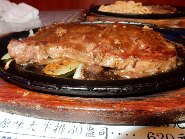 波霸大牛排的特色在於肉片的份量與厚度都增加許多,且將鐵板