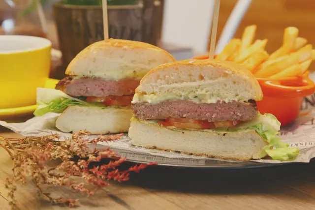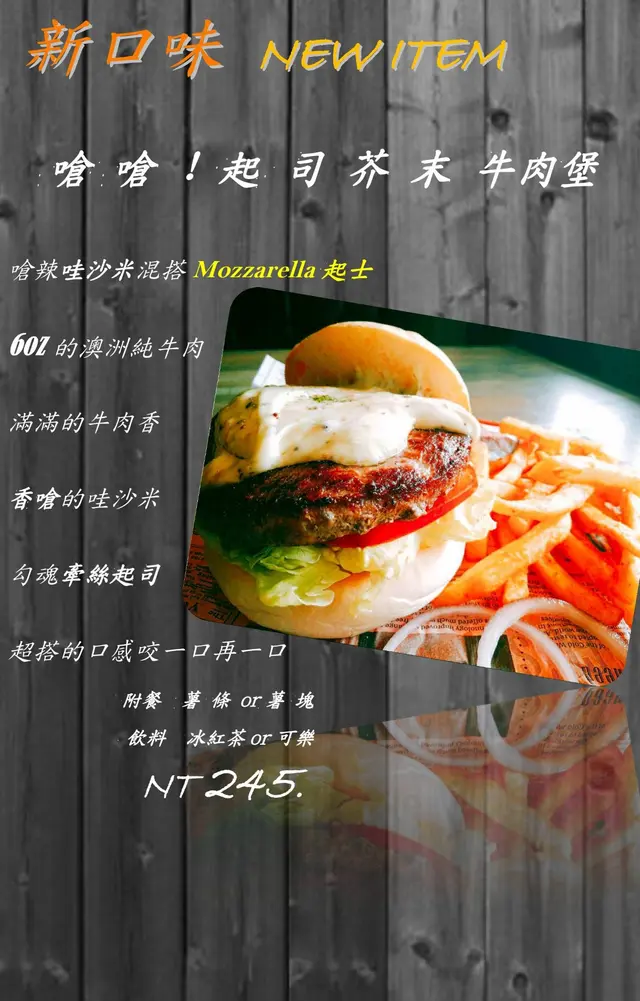 使用超厚手打漢堡排+特調芥末醬,會有這道菜的出現也算是因緣際會,老闆及闆娘某日在中壢吃到某家三明治裡面加了哇沙米,覺得口感很有趣新奇,回到店裡想說應該可以跟漢堡做搭配,經過研究,終於拿捏出醬料的完美比例,就是這有著濃濃”日式風味”的美式漢堡就誕生了!