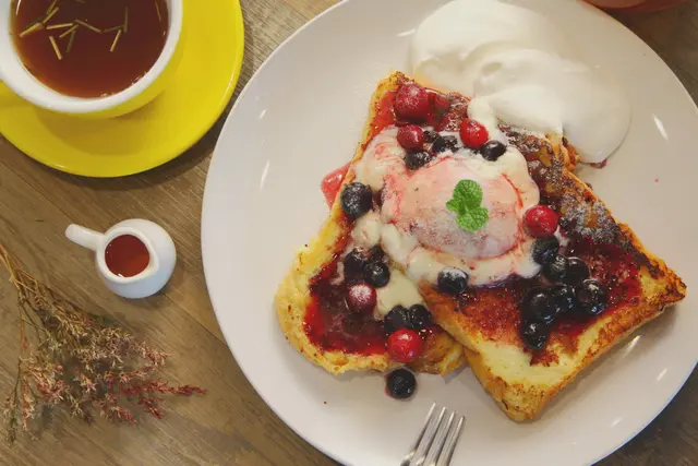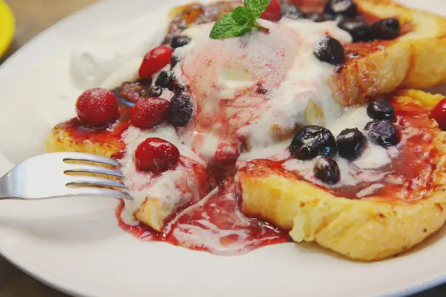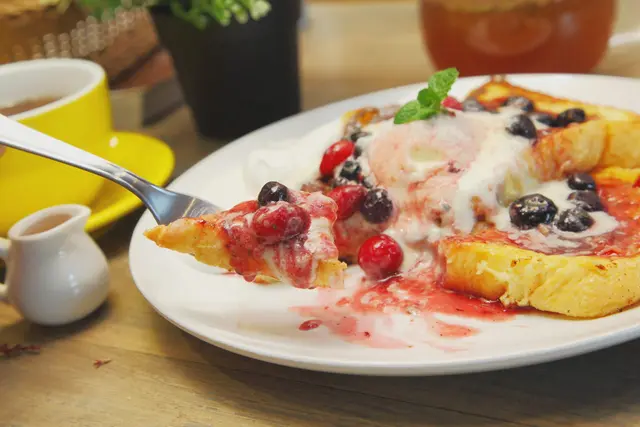 法式丹麥塔是老闆特別挑選的丹麥麵包然後用法式吐司的料理方式,加蛋跟牛奶香煎,上面再淋上老闆特製的野莓醬及撒上滿滿的新鮮莓果,上面還放上大大球的冰淇淋呢