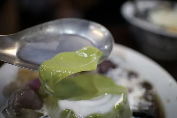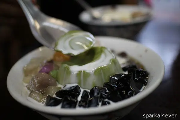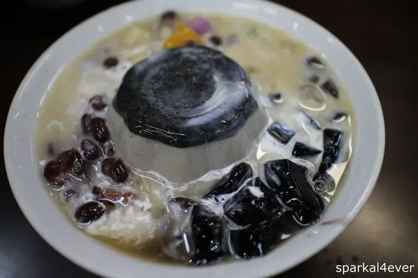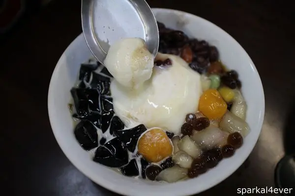 基底湯汁是黑糖漿,在杏仁豆腐淋上奶油球,整碗就變得但米黃色,很是美麗。