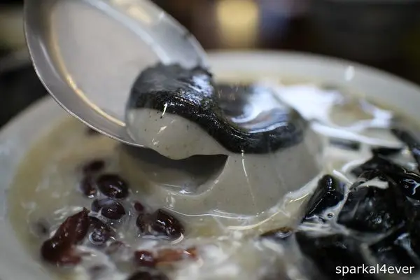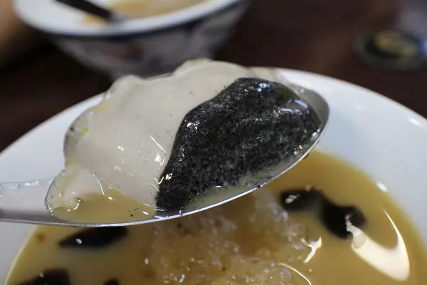 細碎的黑芝麻泥沉在布丁盒下,再放上芝麻豆腐酪而定型,初入口會有淡淡芝麻的香氣,上頭芝麻泥是濃郁的香氣,令人愛不釋口的超好吃豆腐酪!