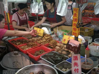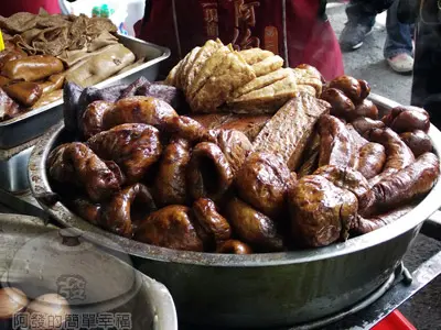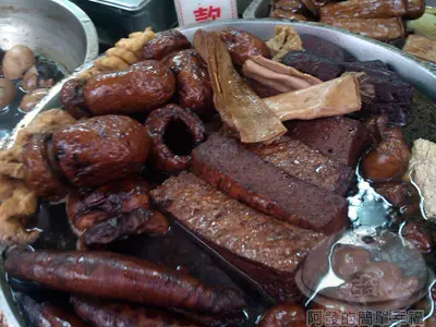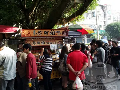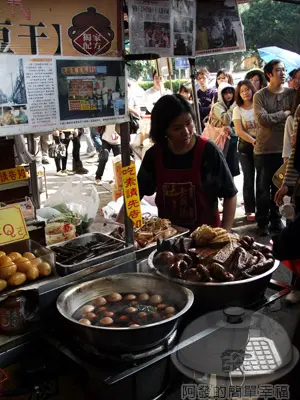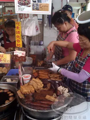 小小的攤車,排滿了長長的人龍,那古早的鐵製大臉盆上,裝滿色澤略成黑金閃閃誘人的各類豆干。另煮沸的滷汁香氣四溢,讓人從旁走過,都不經吞了好幾口口水。可惜當天已吃飽喝足,加上據說要排隊買到,可能要等半個小時以上,只好心想下次再來光顧囉!