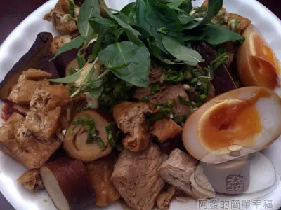 隨手點了,黑豆干、黃金蛋、素腸、花干…等。店家切好後,淋上些許的醬汁,灑上青蔥、蒜末,最後灑上一把九層塔。那滷香及香菜獨特的清爽香味,連我這肉食性動物,心也被撥動了一下。