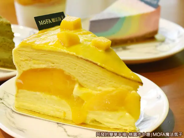 這次二訪「MOFA 魔法氛子」,剛好遇到它推出夏季限定限量,用台南愛文芒果所製作的〝芒果千層蛋糕〞,另我們也吃到了上回已售完沒吃到,在IG很火紅,其外觀色澤如彩虹般美麗夢幻的〝夢想〞。
