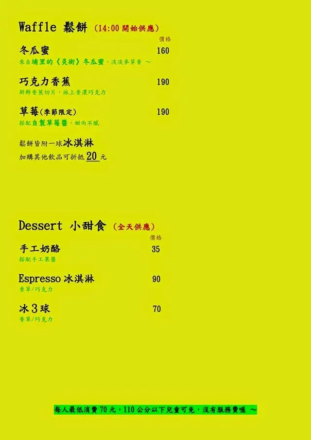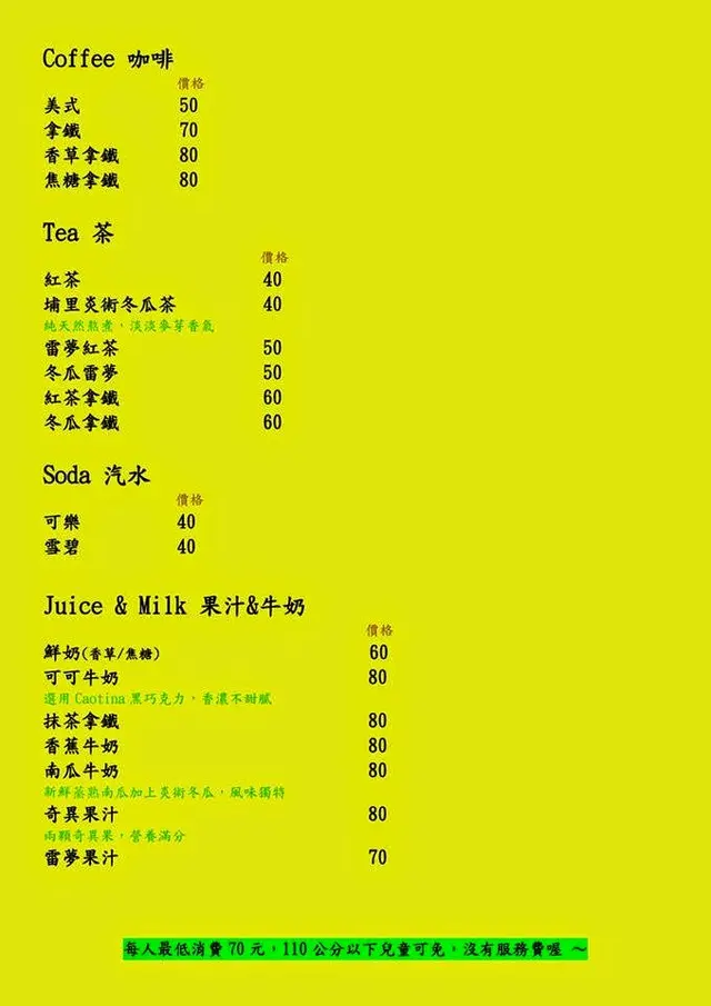 ◆基本消費:每人低消 70元,110公分以下小朋友免低消,免收服務費