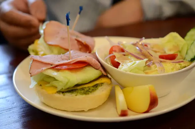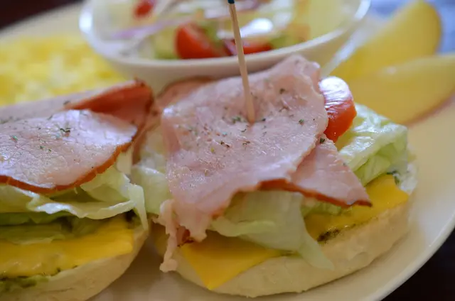 火腿瑪格莉特----圓式火腿+生菜+蕃茄切片+起司+青醬+圓法麵包組合而成