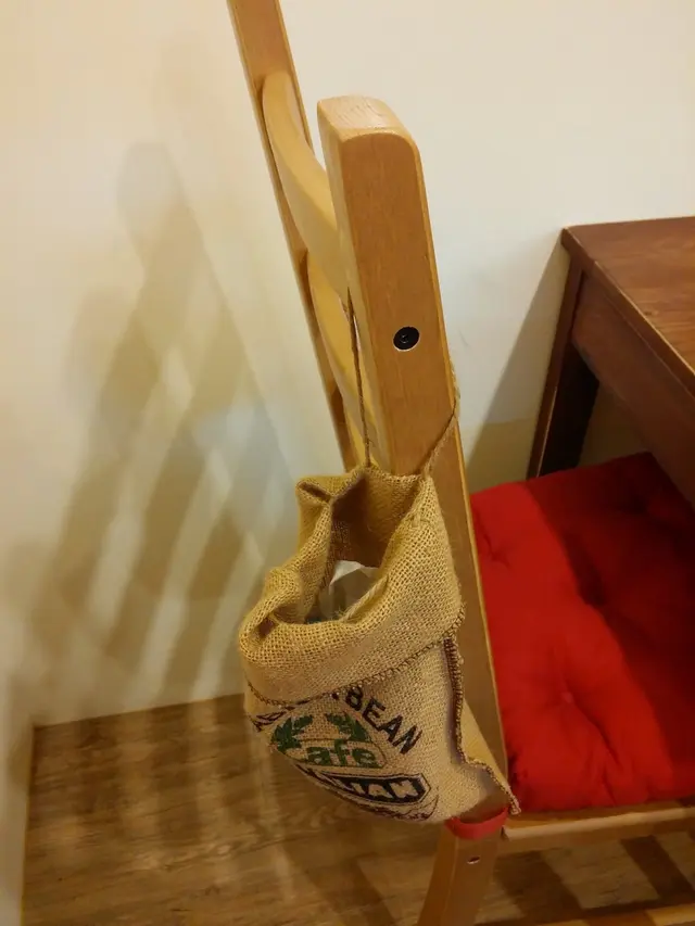 ▼座位區有一排椅子後面都掛著一個咖啡袋子