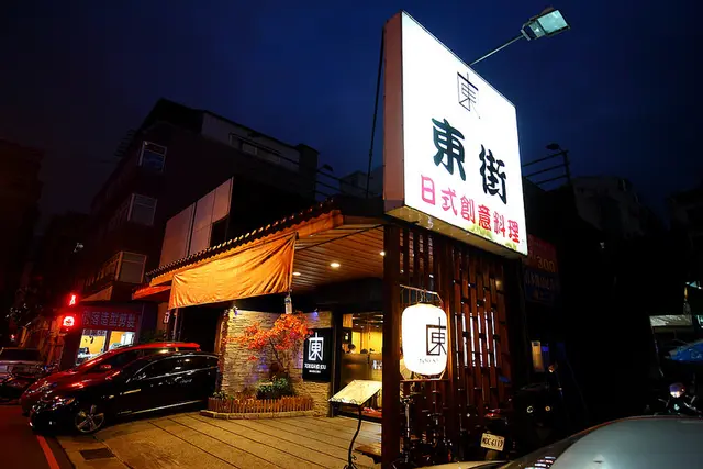 東街日本料理-寶山店外觀裝潢是濃濃的木製日式風格,外掛著白色日式燈籠,夜晚點亮格外有氣氛