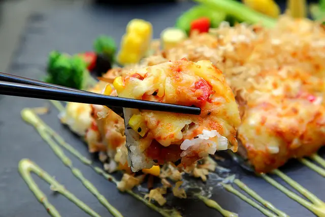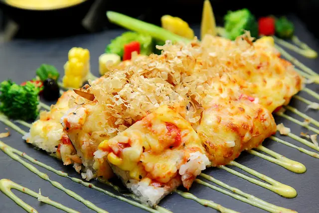 仔細一看,原來這真的是個壽司來著,師傅用海苔鋪底,在海苔上放了醋飯、鮭魚片及玉米