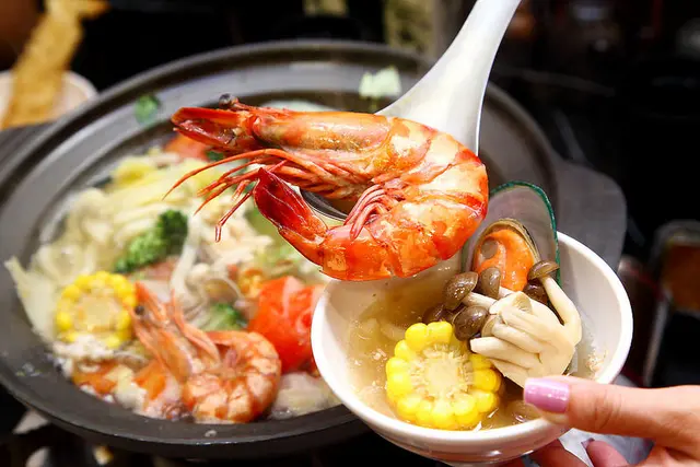 再加一鍋588的膠原蛋白明蝦雙人火鍋,無限續湯喝到飽,一個人都不用700元就飽到不行