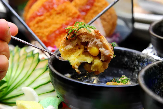 乍看之下就像金跟銀的顏色,外酥內軟的炸薯球搭配蘿蔔泥醬汁