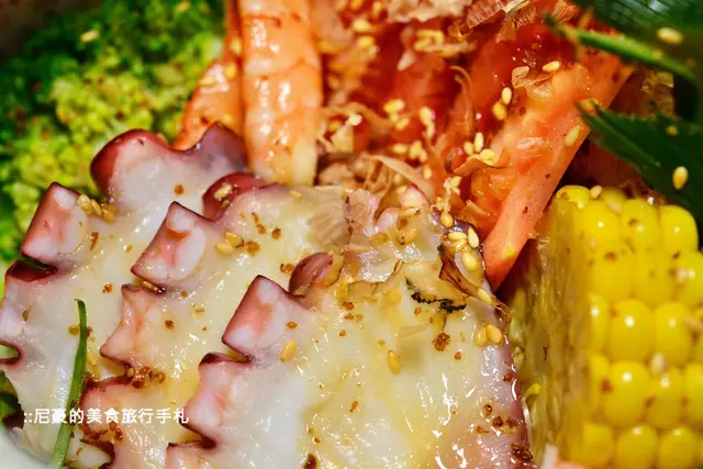 這盆沙拉主要的海鮮有章魚、鮮蝦還有蟹肉