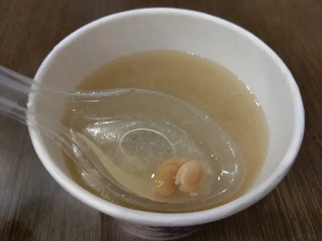 用免洗餐具。附湯為味噌湯,味噌濃度稍淡,但加了柴魚片、海帶