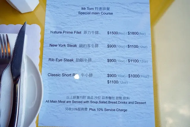 菜單的選擇很多,還有提供義大利麵等,老闆最主推的當然就是他們的牛排了啊,老闆說他們的牛排都比一般人多量,為什麼勒? 拿6 oz來說好了,一般店家是拿出6 oz牛排,但是他會有過多的油脂和筋,店家會把他們修掉之後再上桌,有時肉的油多或筋多,可能會被修到1oz也也是有可能的,不過這也是常理的做法,但是Mr.Tom老闆就是愛吃肉,他說他就是想要給大家大口的吃肉,他提供不管是幾oz,都是修完之後的重量喔~老闆真的非常有心啊^^ 而且價格可都是套餐的價格,包含了飲料、湯品、麵包、甜點唷