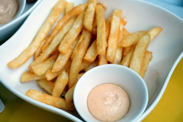 他們現在只要打卡就會送薯條,原本以為就會很一般,但他們的醬料 非 常 厲  害   一入口首先來的濃郁的大蒜滋味,緊接而來的是柔滑厚實的滋味我根本猜不出是什麼啊,他帶點紅色感覺應該是紅椒粉,醬的味道有點像是凱撒沙拉醬,一直沾就吃完了,超順口的啦@@