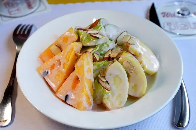 水果沙拉,有3大片西瓜、蘋果和芭樂及生菜,再淋上優格醬 他們的水果沙拉非常讚ㄟ,真的很大氣,而且飯前吃水果是好事啊,我現在常常在都會飯前吃水果,聽說蠻有好處的