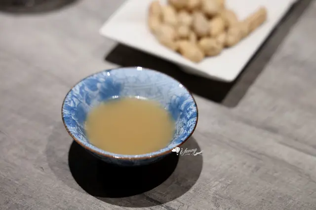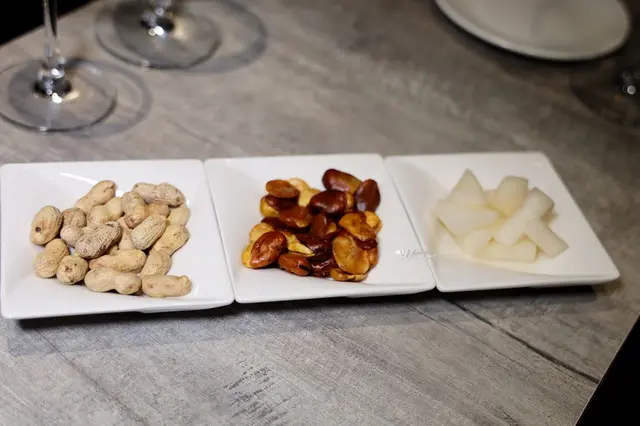 坐下後,桌上擺有三款開胃小菜,是北港知名伴手禮帶殼花生及蠶豆酥, 還有可以免費續加的主廚自製柚漬蘿蔔。另外服務人員會送上熱茶,這天有烏龍茶及香片,我們點了香片,服務人員見到茶不夠了,都會主動續加,超貼心的。