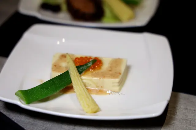 雞蛋豆腐綴以北海道鮭魚卵,簡單的配以秋葵及玉米筍,淋上胡麻醬,清爽又開胃。