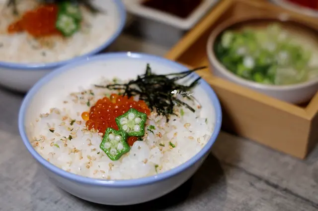 晶瑩剔透的北海道鮭魚卵,搭配日本越光米,飾以海苔絲、白芝麻及秋葵,繽紛的配色,入口咀嚼出的香氣非常地迷人!