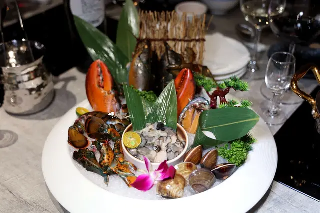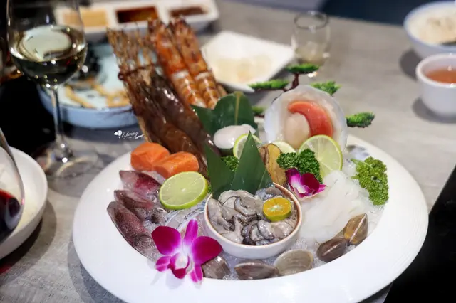 海鮮盤有明蝦、草蝦、活鮑魚、生食級干貝、大扇貝、鮮蚵、蛤蜊、小卷、花枝、鮭魚、石斑。
