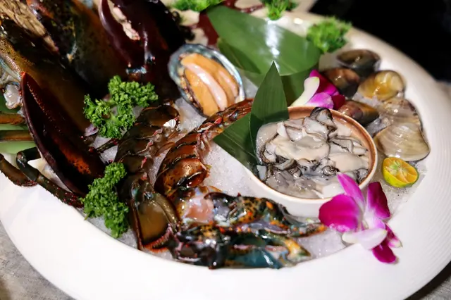 海鮮盤有現殺活龍蝦、活鮑魚、生食級干貝、鮮蚵、蛤蜊,那個活龍蝦肉質的顏色,一看就知道超新鮮的!