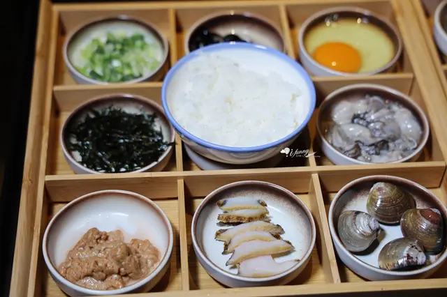 漂亮的九宮格裡,有著講究的配料,有龍蝦膏、活鮑魚切片,鮮蚵及蛤蜊。