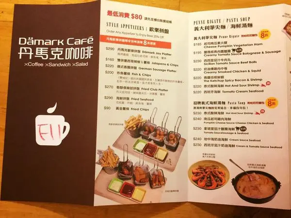 主要有義大利麵、海鮮湯麵、義式帕尼尼三明治、沙拉、墨西哥起司磚餅