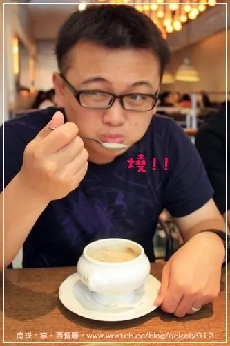 說玩曹操馬上到!我們用飛快的速度點好餐~準備上菜囉!湯內會附上一片烤得焦焦的麵包上還會有一點焗起司鹹鹹的配上濃湯一起吃,真是太讚了~