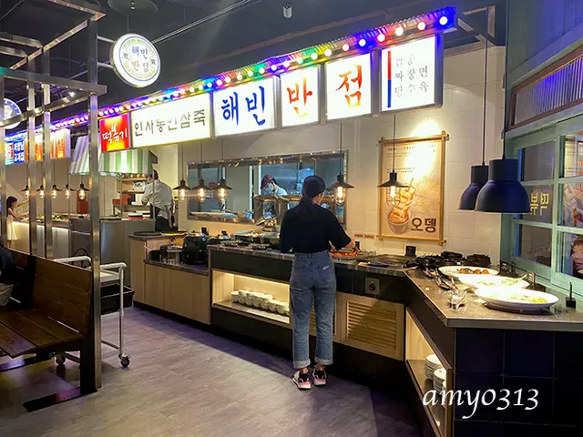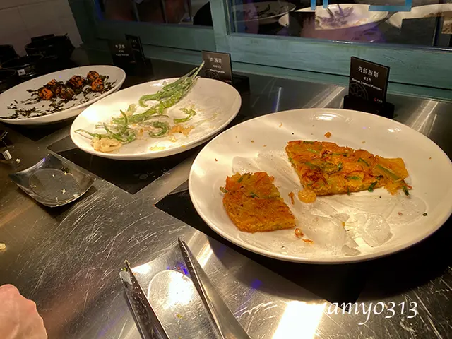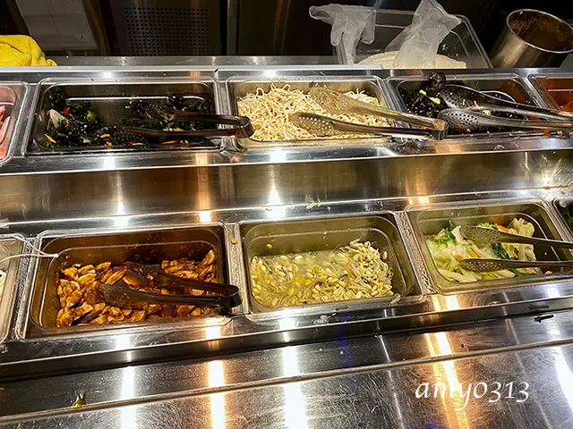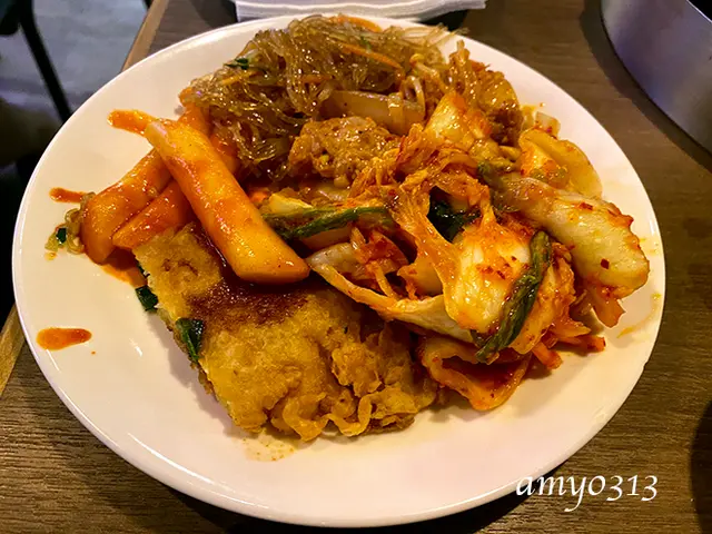 各自拿了喜歡的菜。我倆口味很相近,拿的東西都差不多,涼拌冬粉、泡菜、豆干等都挺好吃的,海鮮煎餅普通,辣炒年糕就差了點。