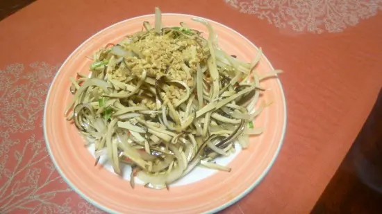 苦瓜鹽蛋,將苦瓜切成薄絲再油炸,去掉了苦味而保留其香氣,調味上偏小辣。