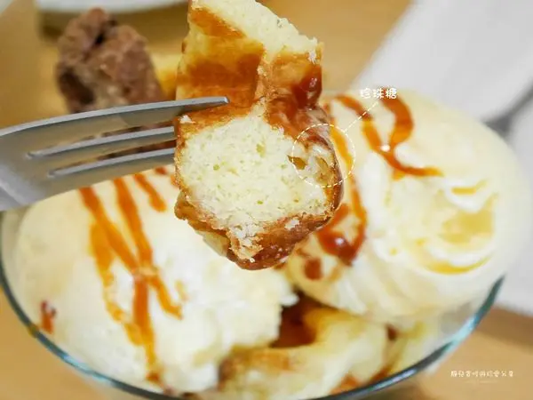 上頭在淋上苦甜的焦糖,原味鬆餅搭配苦甜焦糖及香草冰淇淋,超級好吃