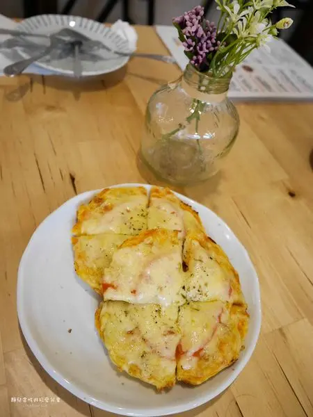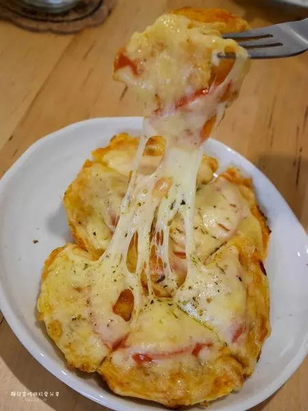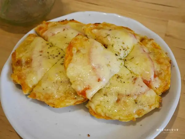 原味的鬆餅上放了一片番茄片,撒上起司下去烤,口感鹹甜鹹甜