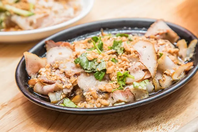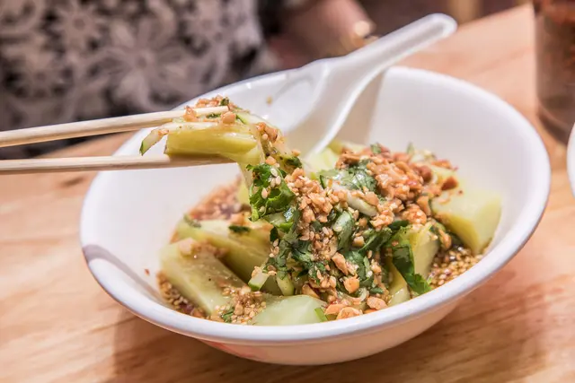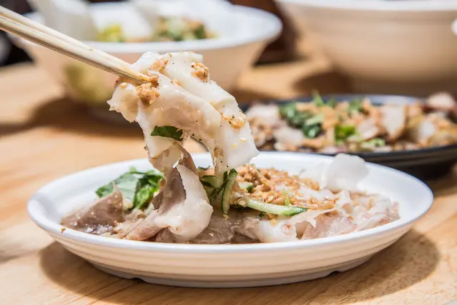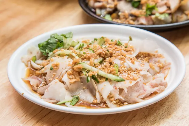 豌豆粉,豌豆粉也是雲南獨有的小菜,是用豌豆曬乾後,磨成粉煮成漿,再冷卻成凍,再淋上酸甜雲式醬汁,豌豆粉吃起來Q軟豆香十足,加上雲式酸甜醬汁、增加香氣及口感的花生碎,酸甜爽口相當開胃
