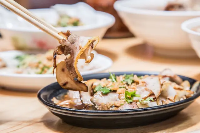 火燒涼拌,火燒涼拌也算是國旗屋的招牌菜了,據說是張老旺爺爺帶著柴火及器具到野外空地生火烤肉,整顆豬頭川燙後,以猛烈大火烤到表面乾黑,再用刀細心刮淨焦黑處,切片再與特製的雲式佐料涼伴,仔細聞可以聞到一股燒烤的香氣