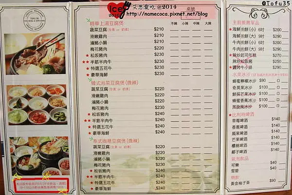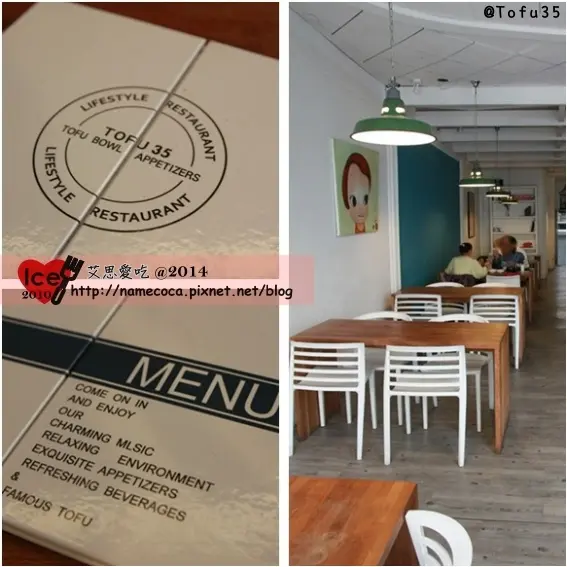 這間Tofu35實在太隱身了!平常逛勤美綠園道只會走在中興街上 =>我啦我啦哈哈,壓根沒注意到這間韓系裝潢的韓式豆腐店,剛好身邊有愛吃豆腐的朋友,今天才會到這裡用餐。↓一進門的裝置藝術『英式電話亭與單車』與暖色裝潢,感覺就像置身在咖啡店, 但!今天要吃的卻是韓式料理!韓式料理啊! ↓用餐環境以白牆、畫、木桌與木地板,顏色簡潔,有種舒服感! 當然一入座店員即遞上菜單,看了下封面,charming mlsic mlsic? Music? ↓餓了吧?來看看菜單!這裡的菜單-豆腐煲真的是簡單明瞭,可自己選辣度 湯頭:精華上湯、韓式泡菜、泰式咖哩 食材:蔬菜、雞肉、豬肉、牛肉、海鮮、豬小腸等‥ =>每個食材都能搭上述湯頭 另外也有海鮮煎餅、飲品類(冰沙、啤酒、氣泡飲品、柚子茶),各品項我個人覺得非常好選擇! 填寫完菜單就到櫃台先結帳,無服務費,只接受現金。 ↓接著四處拍拍,整體環境再次感覺到滿舒服的! ↓點完餐之後即送上紫米飯與韓式小菜8樣,都可免費續點, 這次我們8個人用餐,店家也主動送上兩份小菜,讓我們不用手伸很長。↓小菜都是我自己取名的 XD,所有小菜內我的第一名是青花菜,最不愛黃豆芽麻油椒香青花菜:十足麻油香還有胡椒味,不會太軟桑!但這真的是小菜!都只有一咪咪燉馬鈴薯:味道像台式滷冬瓜,馬鈴薯軟硬適中,我覺得不錯,朋友們覺得非常不錯。涼拌冬粉:應該是灑了五味粉,吃起來很Q,但我覺得口感太乾。青龍辣椒與小魚乾:請注意!真的沒跟你開玩笑!這辣椒,一點都不辣。海帶:滑滑的,然後軟硬適中。涼拌洋蔥:吃起來脆又不會太涼,而且不會嗆,覺得不錯。豆芽菜:脆的,但口味偏酸,我不喜歡。甜不辣:看起來顏色頗紅,但吃起來沒什麼味道,口感是軟嫩的。↓接下來就上煲啦! 我吃的口味是 泰式咖哩-半筋半肉牛 NTD240 首先紫米飯,吃起來是濕軟口感,喜好度一般,我個人偏愛QQ粒粒的, 不過紫米飯這東西,有些人不會喜歡耶,不知道店家有沒有白米飯?↓豆腐煲裡面,有許多嫩豆腐,4-5片左右半筋半肉牛、金針菇等菇類、蛋, 嫩豆腐吃起來是滿嫩的,而且不會容易散開,蠻滑嫩的,但我沒覺得驚豔好吃。 半筋半肉牛,這個‥雖是半筋半肉,但整塊都很軟,沒有軟帶Q的口感,但很夠味,可是我覺得太軟了 其他小配料一般,湯頭有泰式的香料香,咖哩味非常微弱,整體來說口味上還不錯。↓然後!!! 這次文章已經到尾聲了啊!這次8個人去大家都很客氣,各點一個豆腐煲完全沒有在加點任何品項 導致這篇文章介紹完小菜、豆腐煲就結束了,真是無比快速, 不過,還是看一下我的總結在去另搜文章吧
