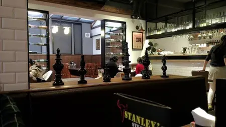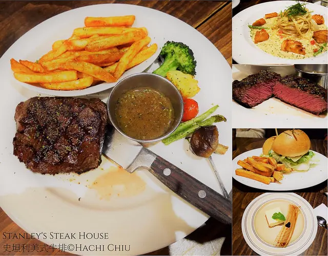 stanley's steakhouse位在新竹巨城附近一直聽說這間頗負盛名於是便選擇某平日中午前往 即便是在平日中午,一樓也將近有八分滿的人潮雖然二樓並未開放,不過環境和服務整體來說算是不錯這裡的牛排都是單點,加100元套餐可以多飲料和湯及奶酪然而一份基本的牛排餐就要400~500,所費不貲今日的濃湯是蛤蜊海鮮濃湯蛤蜊的味道很濃,再搭配上牛奶的味道是蠻好喝的一盤湯不過朋友有吃到沙子去反應之後服務員的態度也很客氣與廚房詢問之後給的答覆是說這些蛤蜊都是包裝過買進來的沒有再另外處理(也就是說,蛤蜊都是買外面包裝非使用活生生的蛤蜊摟!?)服務員也有詢問我們是否要再換一盤湯。炭烤雞腿排餐這道菜算是相較之下比較便宜的一道了排餐類的都會附薯條或是薯泥烤得很香,雞肉非常嫩,帶有煙燻後的焦香味薯條也炸得酥脆雪花牛肉16盎司七分熟配菜是薯條/薯泥和幾根豆子與一片杏包菇有一點少~不過主食牛排倒是很大一塊可以兩個女生一起點一餐~外頭烤的焦香味十足以刀子從旁邊切下去的感覺也是非常軟嫩搭配牛排醬或是玫瑰鹽都是很棒的口感然而,怎麼牛肉吃起來卻是溫溫的感覺連薯條都比牛排燙...... 七分熟的肉,越是到中間的部分越紅而且越吃越冷...還好他們有一個服務可以幫你把肉再加熱覺得不夠熟可以跟他反映於是反映了之後幫我們烤熟一點薯泥也重新幫我們加滿但是,吃到中間又是冷的而且很生後來又第二次請她幫我回烤還把肉切小塊小塊讓內部比較容易熟然後,吃掉一部份的薯泥又再次加滿了XDD連盤子也換了一個新的炸魚薯條這是上層擺炸魚條,而下面仍然是薯條魚條外酥內軟,薯條和牛排餐的薯條是一樣的吃完整體下來他們的服務很好,待客周到店面裝潢也很棒然而牛排卻越吃越冷,不過份量非常充足!希望下次來的時候能夠看到有其他的改進~…查看更多