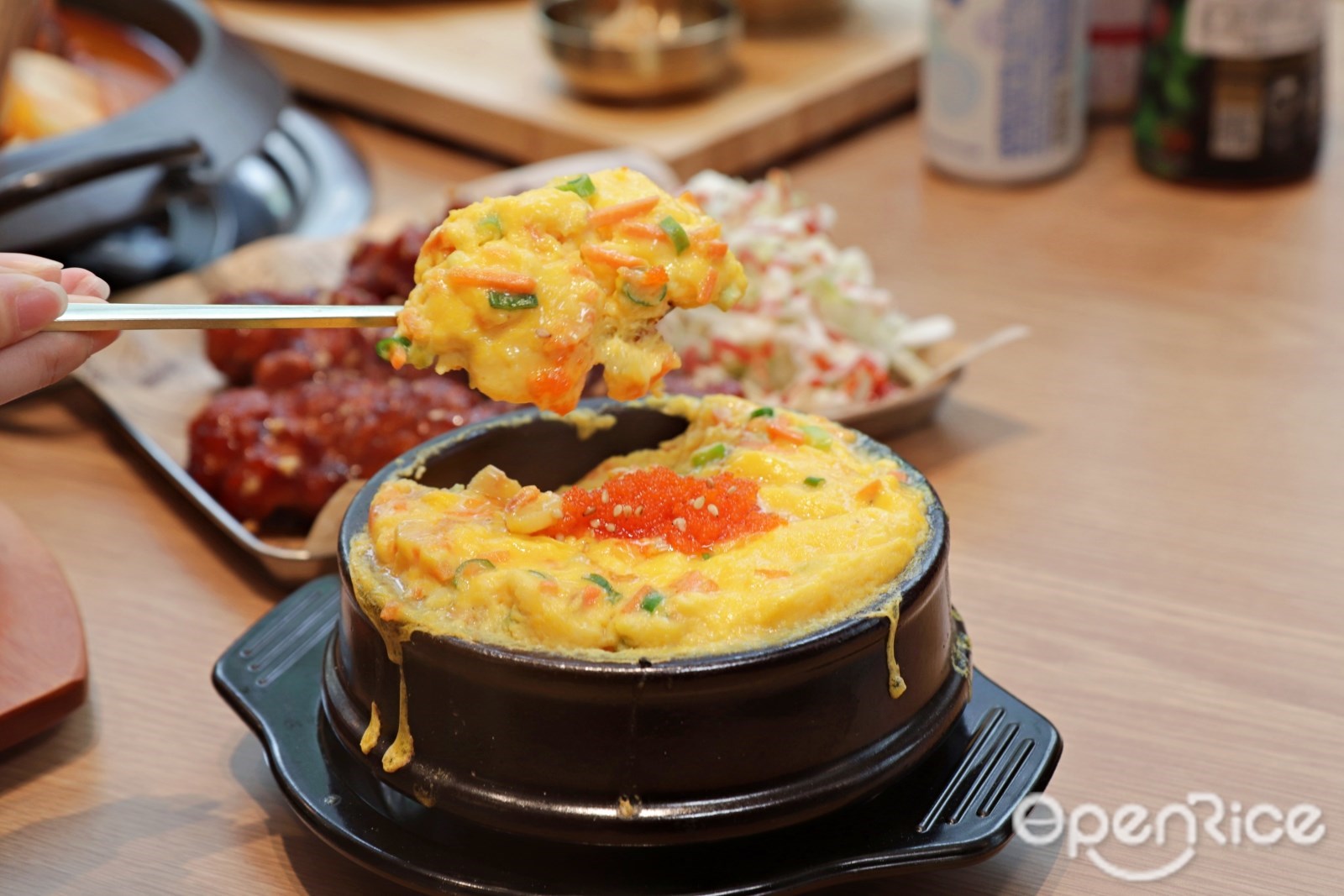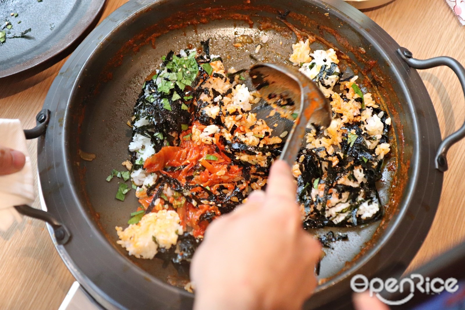 此外,馬鈴薯排骨火鍋在Uncle-K還有多種吃法,不只能撈到熱騰騰的韓式湯物與排骨,Uncle-K更是讓饕客可以吃到不倒翁韓式泡麵與神級炒飯,凡只要點主要鍋物並有加點其他兩道菜餚的消費者,店員即可用剩下、已經被煮進排骨滿滿精華的湯底來煮一鍋「神級炒飯」,炙熱的鍋底內讓白飯與湯汁迅速融合,接著拌入老泡菜、韓式海苔絲,與粒粒分明、在口中迸發口感的飛魚卵,滋滋作響的聲音與撲鼻而來的香氣,帶有些許鍋巴酥脆口感,口感濕潤不膩的「韓式飛魚卵炒飯」。
