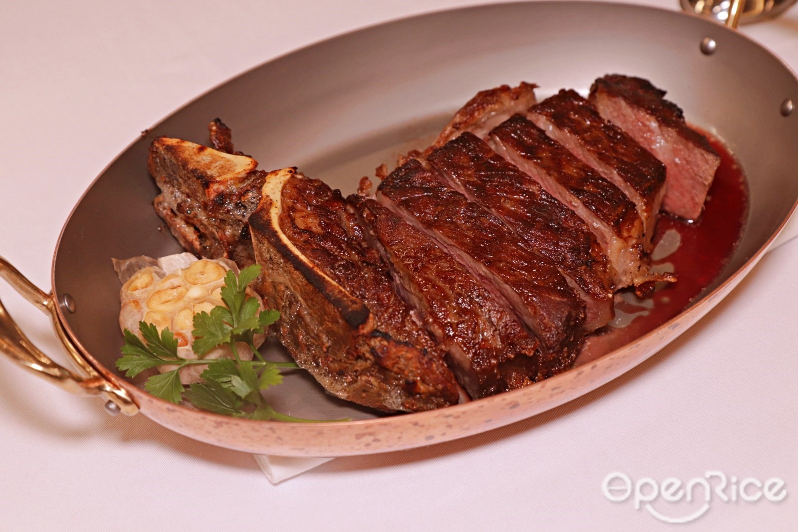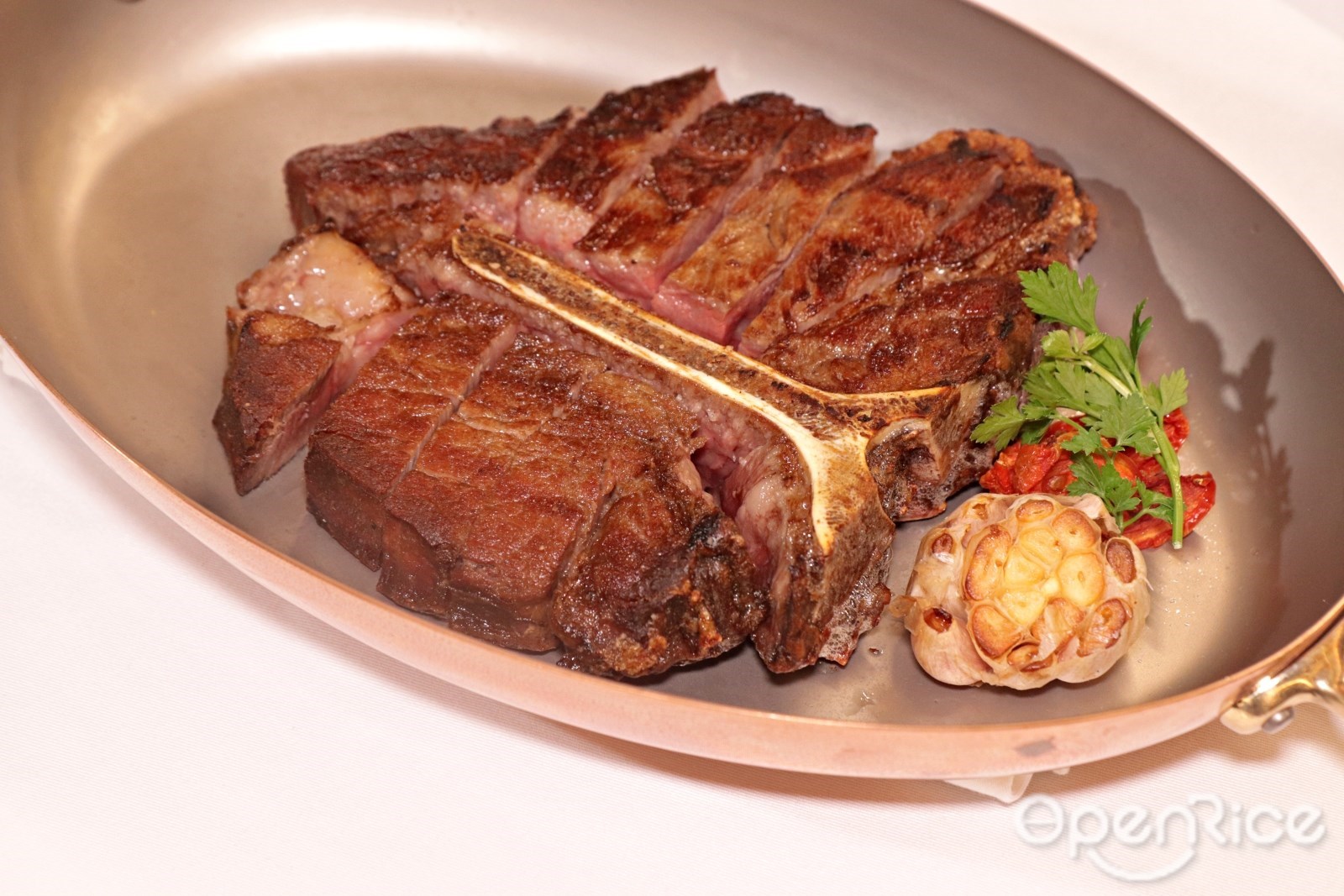 「美國極光牧場乾式熟成35天丁骨牛排30盎司」讓饕客一次吃到紐約客與菲力部位,紐約客牛排的輕柔嚼勁及油花的雙重享受,還有骨邊小碎肉充滿焦香味,啃出牛肉最精華的美味。。