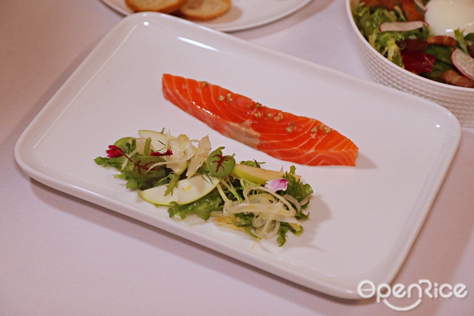「手工煙燻鱒鮭・青蘋果・茴香沙拉」選用挪威現流鱒鮭,體型約六公斤,脂肪比例恰到好處、肉質緊實細膩。以法國布列塔尼灰海鹽輕醃六小時後風乾一夜,再以蘋果木低溫冷燻八小時,讓果木香氣緩緩滲入魚肉纖維,呈現柔和而深邃的煙燻氣息。搭配以青蘋果與山當歸製成的清爽醬汁,並點綴茴香增添層次,