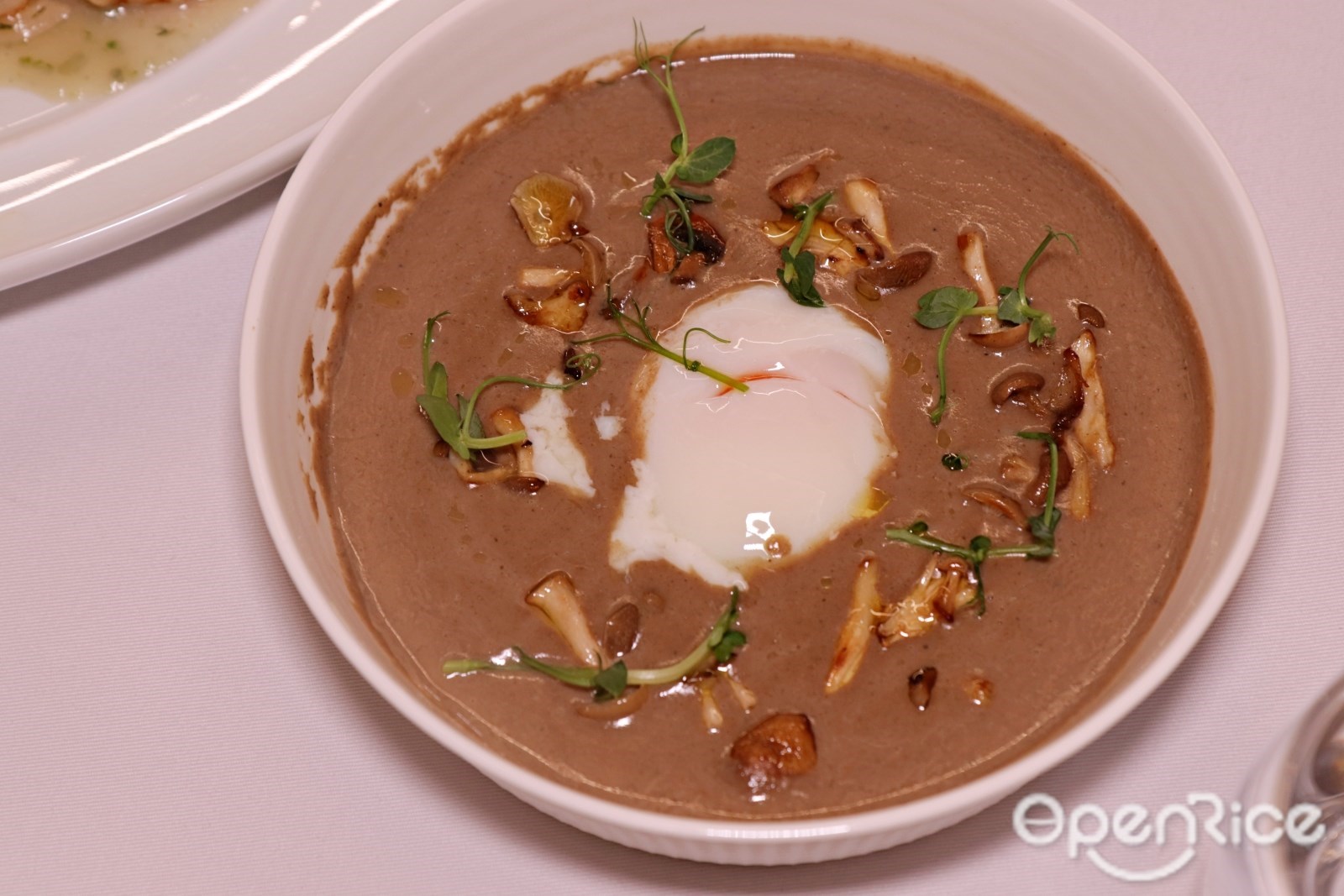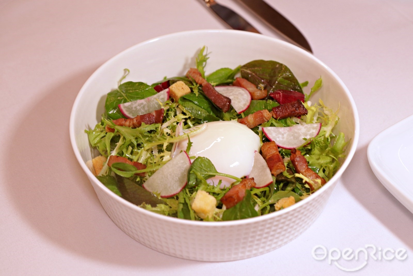 「里昂沙拉 」嚴選翠綠的法式綠捲萵苣,其微苦的獨特風味是向傳統致敬的靈魂基底,搭配經典的法式油醋醬汁,以紅葡萄酒醋和芥末平衡酸度。畫龍點睛的加上金黃酥脆的培根丁,與表面煎至焦糖化、內裡香軟濃郁的麵包丁。最後,放上一顆溫泉蛋,以其金黃的蛋液緩緩流下與醬汁完美交融。