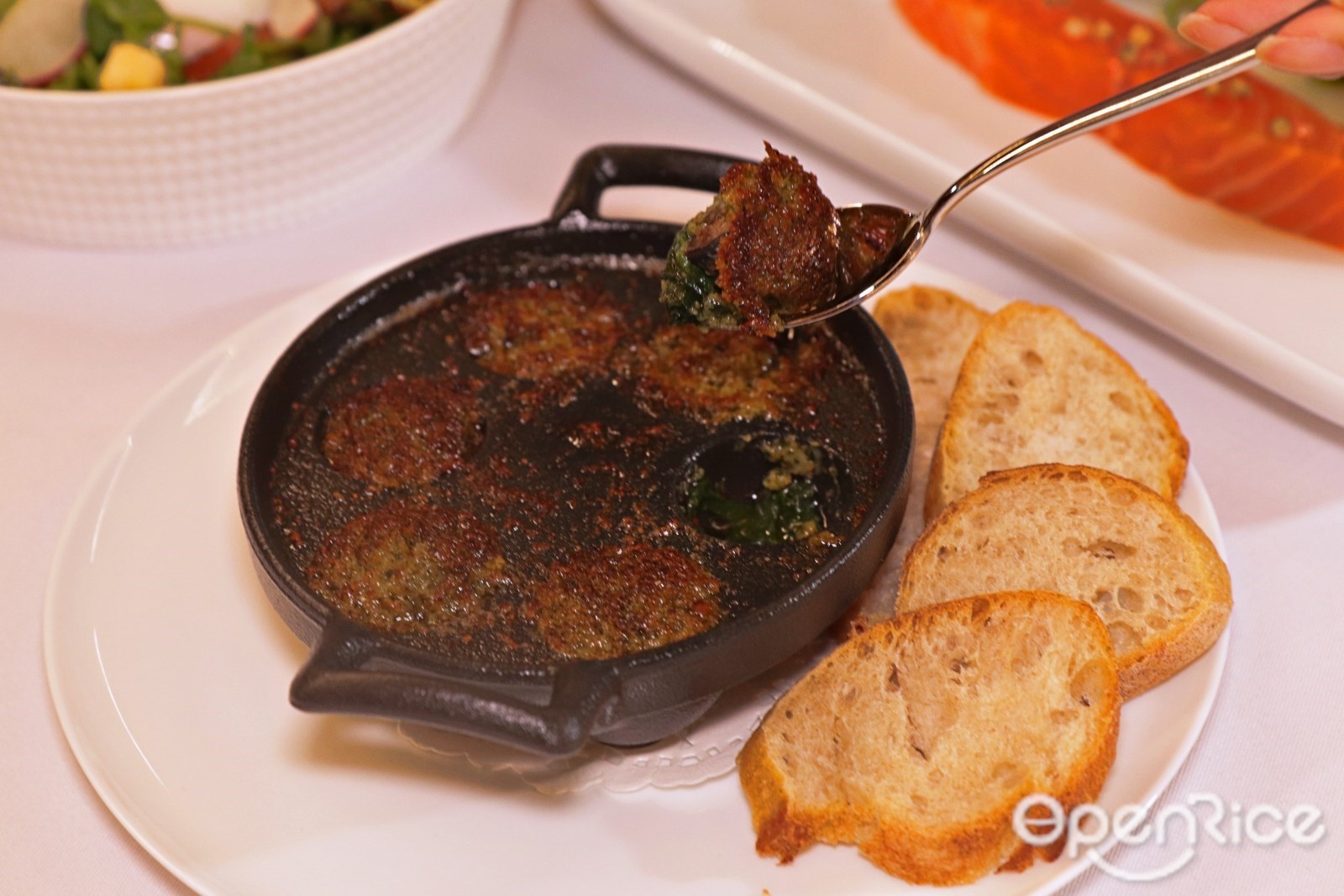 經典法國料理「布根地烤蝸牛」選用法國進口布根地灰蝸牛,肉質細緻柔軟、香氣純淨、風味溫潤。搭配傳統布根地香料奶油醬,以歐芹、蒜頭與發酵奶油調製,烘烤後香氣濃郁、層次豐富。