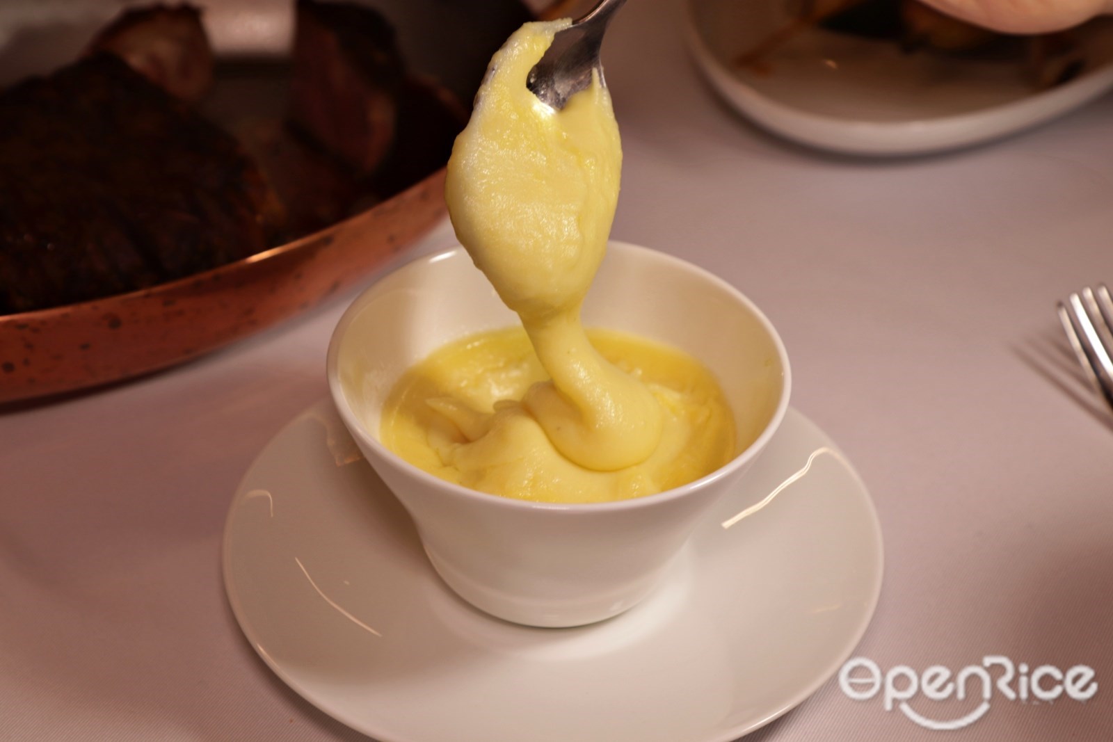 經過三次過篩費時費工成就的「奶油馬鈴薯泥」綿密口感差點喧賓奪主搶了牛排風采。